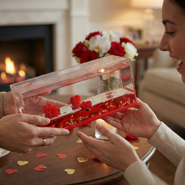 Batmayan kalpli güllü akvaryum hediyelik, romantik ve anlamlı tasarımıyla özel günlerde sevdiklerinize unutulmaz bir hediye alternatifi sunar. Şeffaf akvaryum görünümüne sahip bu dekoratif ürün, su içerisinde batmadan duran kırmızı kalpler ve güller sayesinde göz alıcı bir görsellik oluşturur. İç mekân dekorasyonunda sehpa, masa, vitrin veya raf üzerinde rahatlıkla kullanılabilir ve bulunduğu ortama sıcak, romantik bir hava katar. Estetik detayları sayesinde Sevgililer Günü, evlilik teklifi, yıl dönümü, doğum günü ve özel sürprizler için ideal bir seçimdir. Dayanıklı yapısı uzun süreli kullanım imkânı sunarken, bakım gerektirmeyen dekoratif formu ile zahmetsiz bir şekilde sergilenebilir. Hediyelik olarak tercih edildiğinde duygusal değeri yüksek, şık ve dikkat çekici bir ürün olarak öne çıkar.