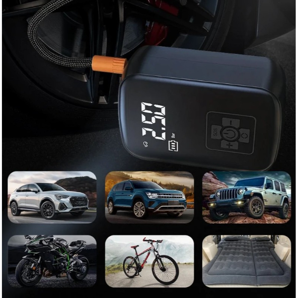 Şarjlı hava kompresörü, dijital LED ekranlı ana ünitesi sayesinde gerçek zamanlı basınç ölçümü yapabilir ve Bar, PSI, KPA gibi birimlerde takip imkânı sunar. Belirlenen basınca ulaştığında otomatik kapanma özelliği ile güvenli ve pratik bir kullanım sağlar. Kompakt ve taşınabilir yapısıyla öne çıkan cihaz, dayanıklı örgü korumalı hava hortumu sayesinde yüksek basınca karşı dayanıklıdır. Mandallı vana başlığı sayesinde kolay bağlantı yapılabilir. Ürünle birlikte gelen çoklu başlık adaptörleri arasında bisiklet vanası, motor vanası, top iğnesi ve şişme oyuncak adaptörü yer alır. Powerbank ya da araç şarjı ile kolayca şarj edilebilir olması, mobil kullanımda büyük kolaylık sağlar. Araba, motosiklet ve bisiklet lastikleri ile birlikte futbol, basketbol, voleybol gibi spor topları ve şişme yatak, deniz botu gibi ürünlerde rahatlıkla kullanılabilir. Hafif tasarımı, basınç birimi seçme imkânı ve hızlı şişirme kapasitesi ile kullanıcıya pratik bir çözüm sunar. Şarjlı kullanımı sayesinde kabloya bağlı kalmadan her ortamda kullanılabilir.