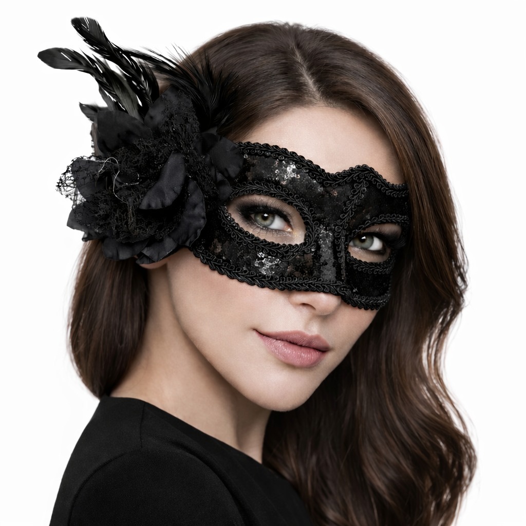 Siyah Venedik Parti Maskesi – Çiçekli Tüylü Payetli